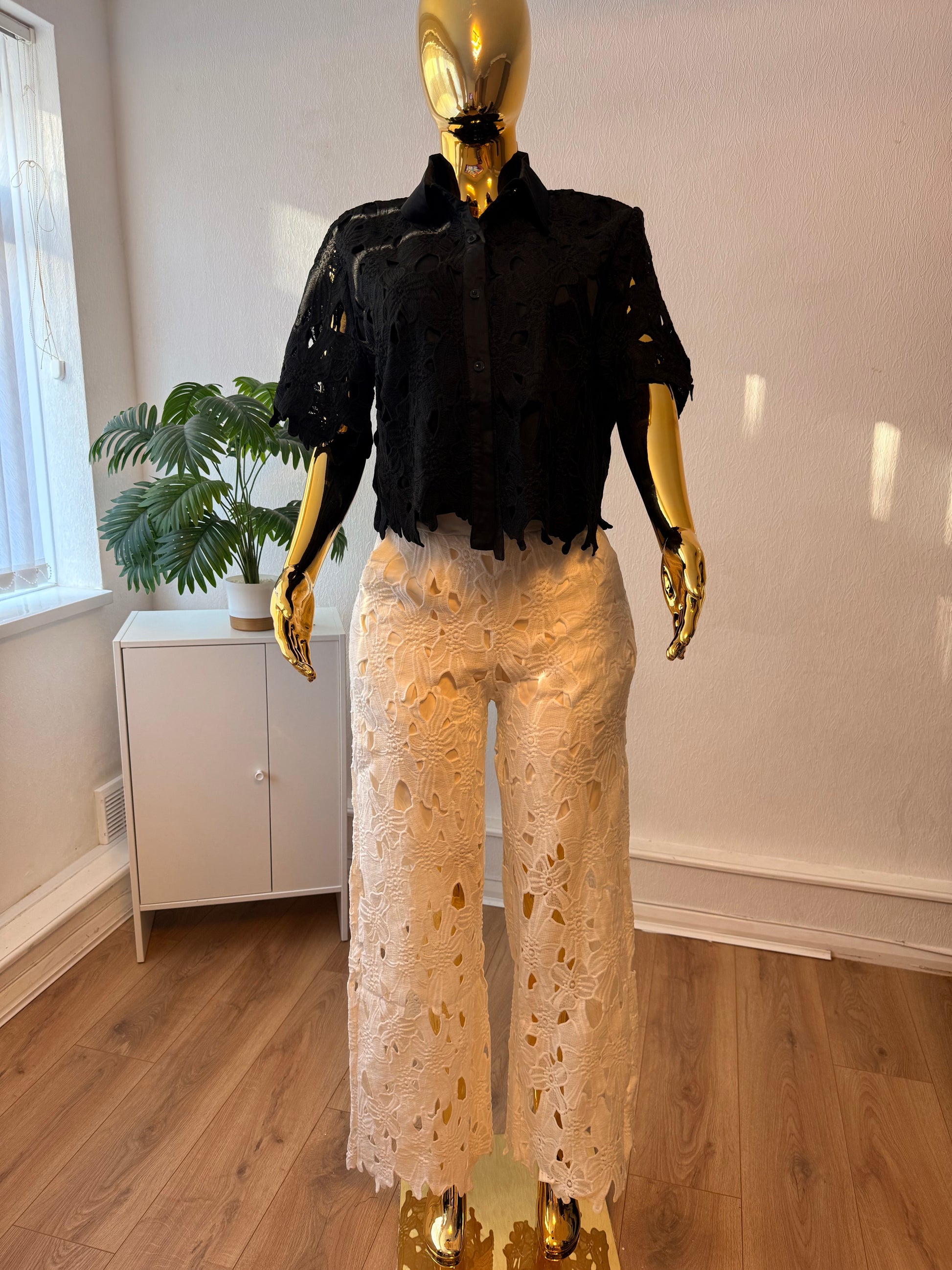 This lace co-ord set is all about comfy and cool vibes. The crop top has sleeves and well fit that's perfect for brunch date or dinner date. The wide leg trousers make it feel relaxed but still super put together. Wear it with sneakers or slides and you're ready to head out or lounge in style.